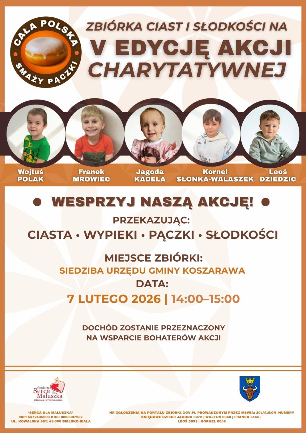 ZBIÓRKA CIAST I WYPIEKÓW ODBĘDZIE SIĘ W DNIU 07.02.2026r. W SIEDZIBIE URZĘDU GMINY W KOSZARAWIE W GODZINACH OD 14:00 DO 15:00